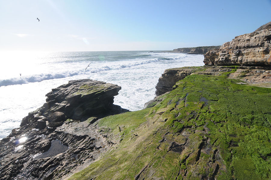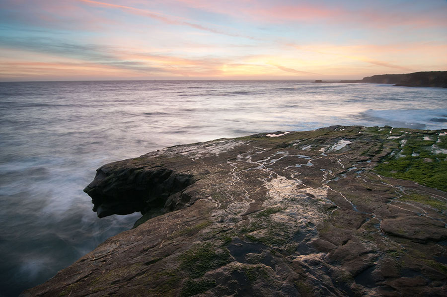 In early 2010 I was spending a lot of my afternoons scouting the Santa Cruz coast for new locations to shoot. On March 13th I came across a neat shelf which showcased cool features like a gaping sea cave, vivid green algae, and this rocky pinnacle. Even cooler, as the waves crashed against the shelf they would wrap around this pinnacle and form a 15-foot waterfall down the back side.