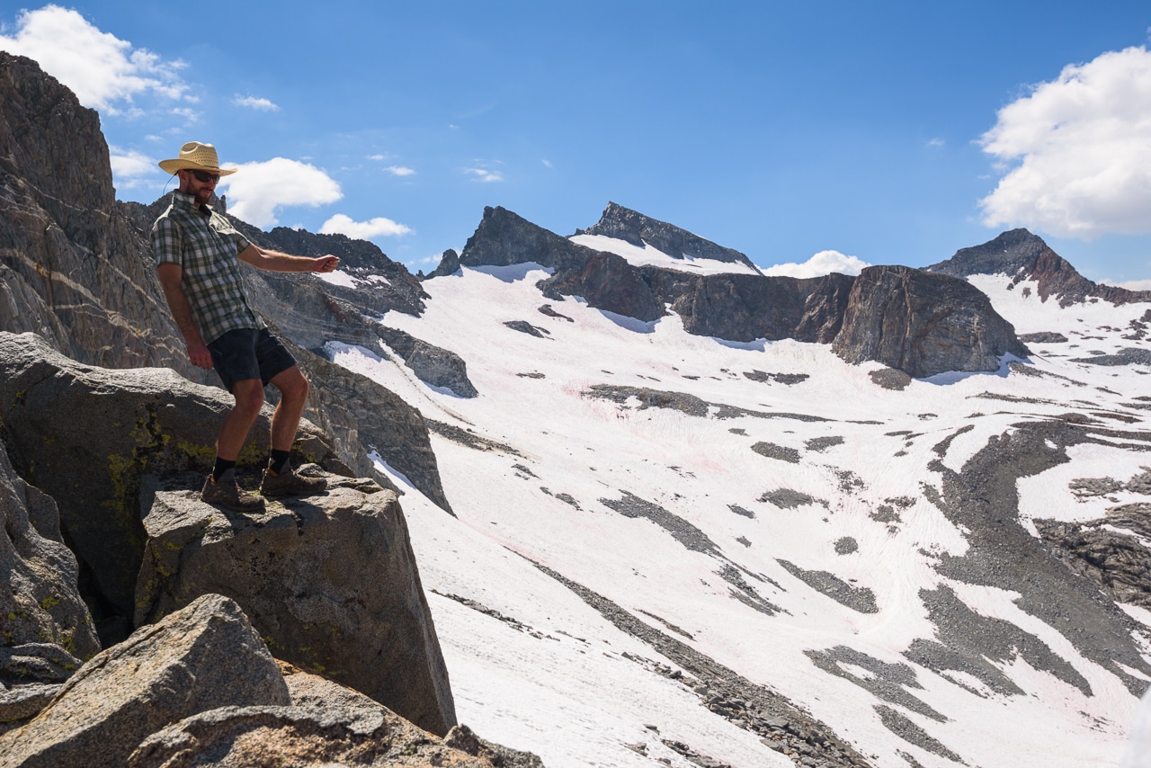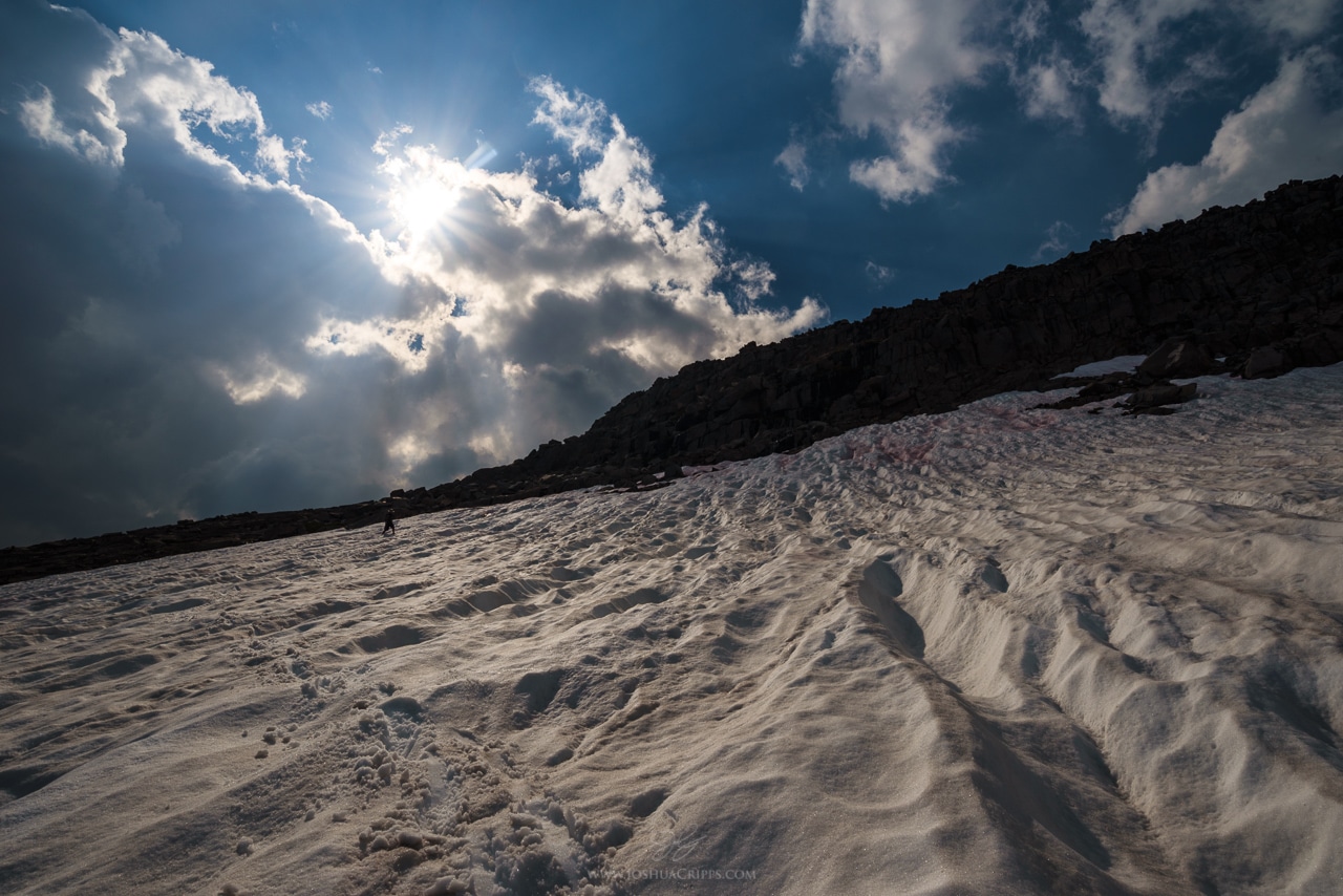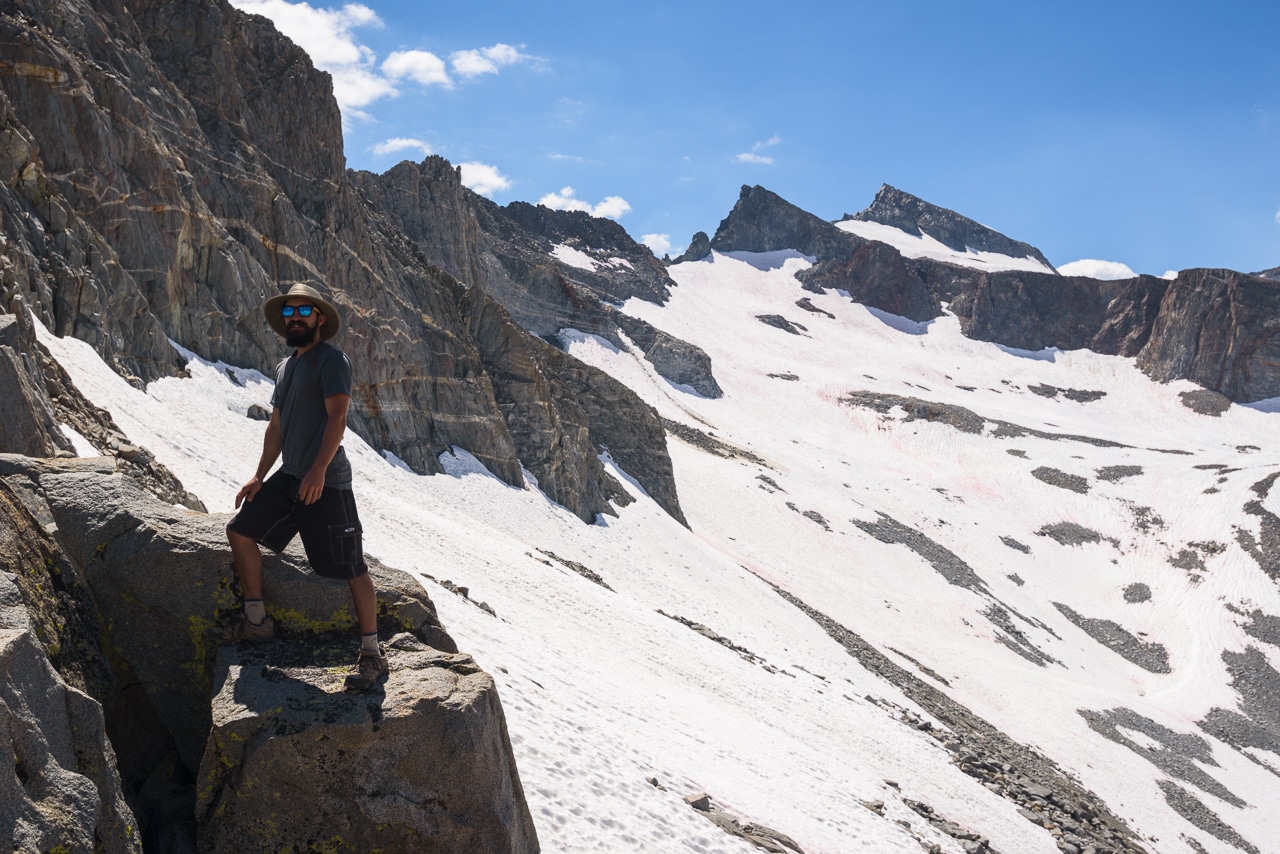 After an hour and a half from camp we came across our first snow field. The sun was already high and the snow was mush. On one hand that meant it was easily traversable without crampons. On the other hand, it meant the going was slow and slippery. We set our sights on a saddle barely 1/4 mile distance and started plodding, sliding, and cursing. 20 minutes later I was off snow and climbing up the class 3/4 rocks to the saddle. Joe joined me a short while later.