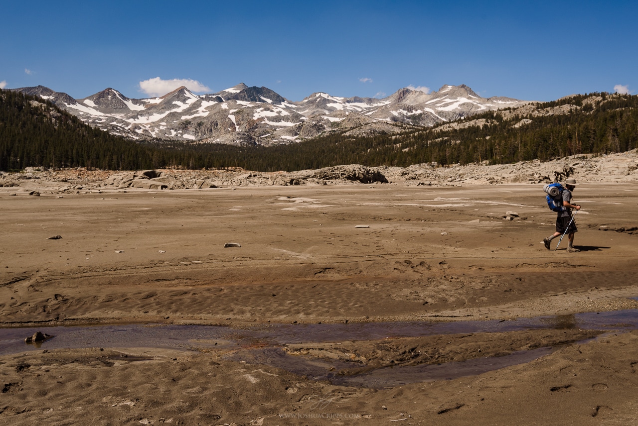A few hours walk brought us to Billy Lake where we stopped to chat briefly with some cowboys and were promptly swarmed by mosquitoes. We DEETed up and skedaddled. A short while later we found ourselves confronted by the dam of Waugh Lake. As we followed the trail around the dam, the lake itself came into view. Or should I say some muddy flats came into view. For some reason unknown to us the lake had been drained leaving behind a huge expanse of mud, rocks, and sawed-off tree trunks. We decided that crossing the lake would be faster and easier travel than staying on the sinuous trail through the woods, so we scrambled down onto the mud. The going was really easy, and we found ourselves ankle-deep in mud only once or twice. Reaching the head of the lake we bushwhacked up through the forest for a few minutes till we rejoined the trail. From there another 20 minutes brought us over some cool log bridges to the John Muir Trail.