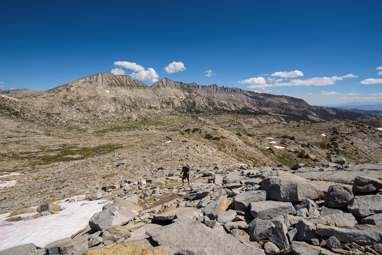I’d been to this Marie Lakes basin once before on a hike from Tuolumne Meadows to Mammoth in 2013. And what struck me about the basin then still held true: it’s an endless expanse of meadows, shallow pools, bifurcating streams, and small cascades. The natural landscaping is so perfect it looks like a landscape architect planned the whole thing. “And we have it all to ourselves. I highly doubt anyone but us is in this basin right now,” I told Joe instants before we came upon a small settlement of four tents. D’oh. “Ah well, I’m sure we can find a camping spot far away from them.” But after 15 minutes of searching it was clear that this cluster of tents was in one of the only flat patches of ground in the area suitable for camping. “Welp, I guess we’re sharing land tonight.”