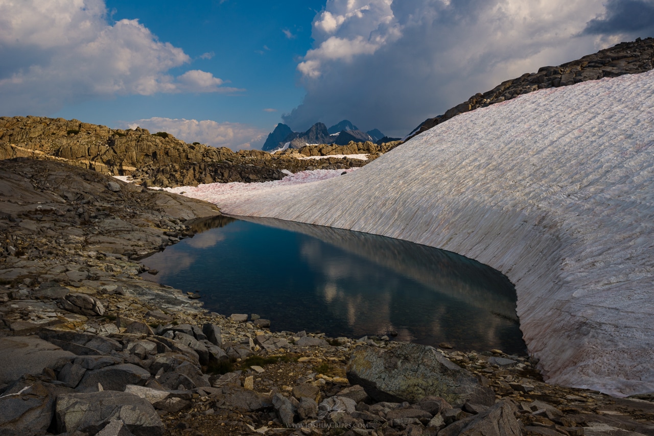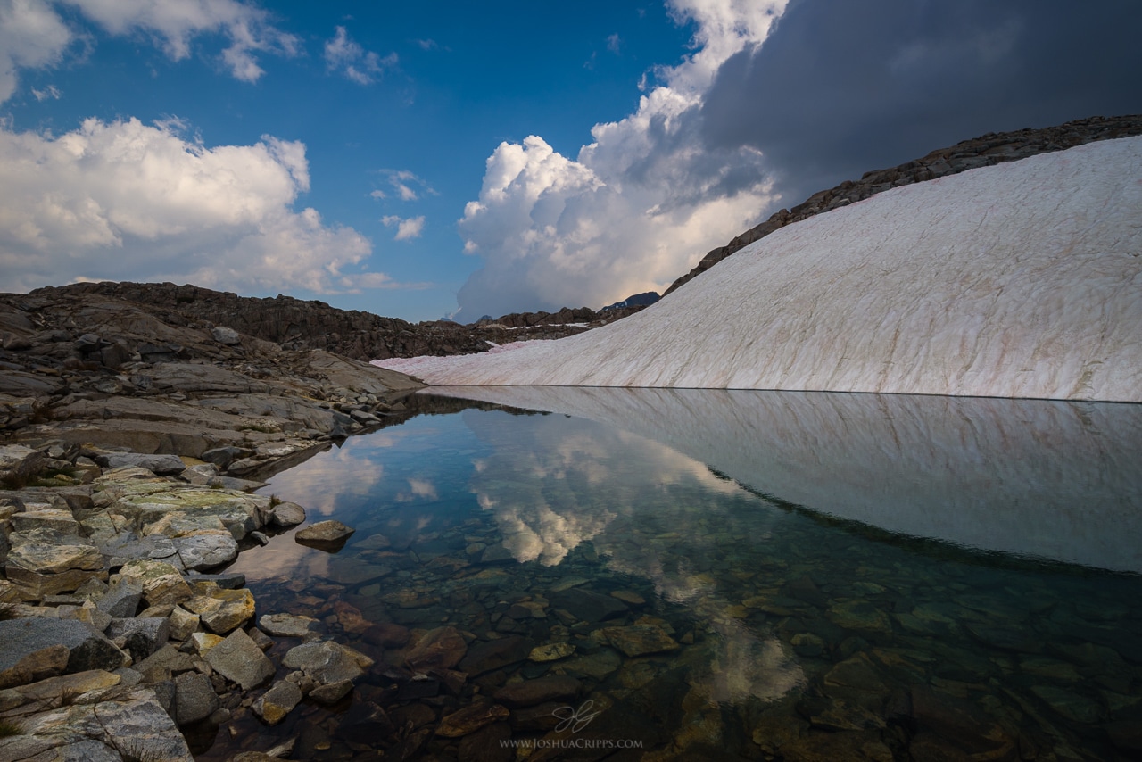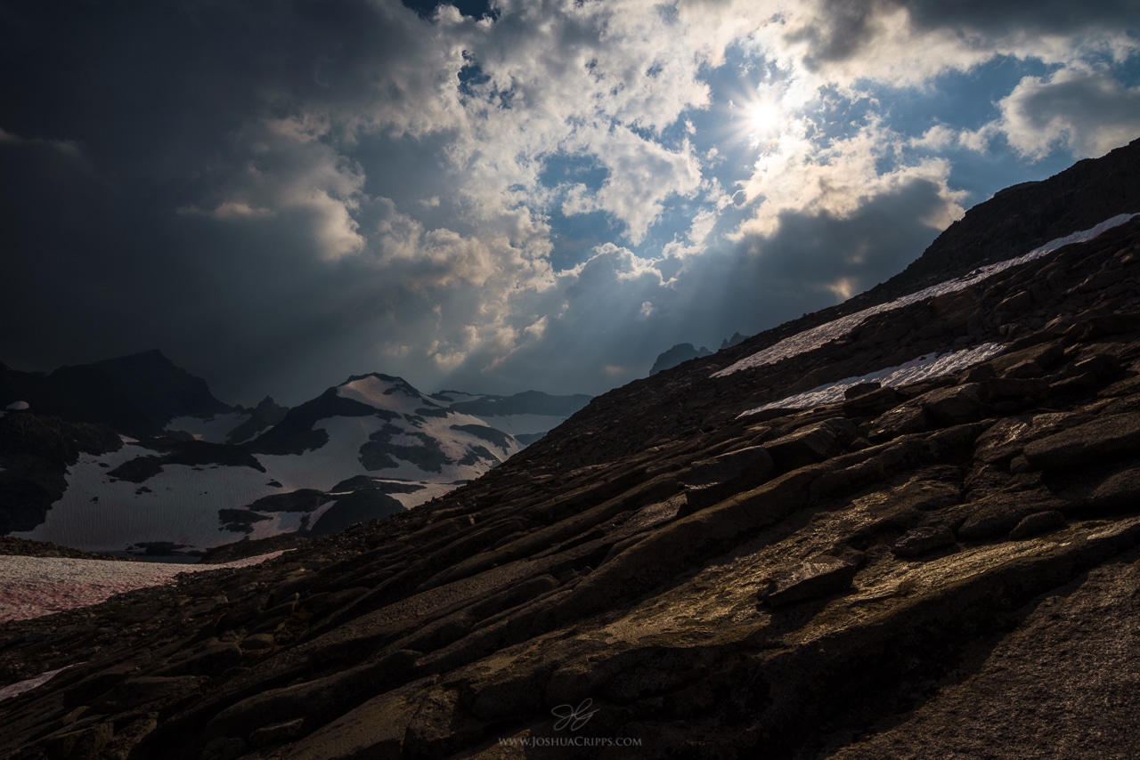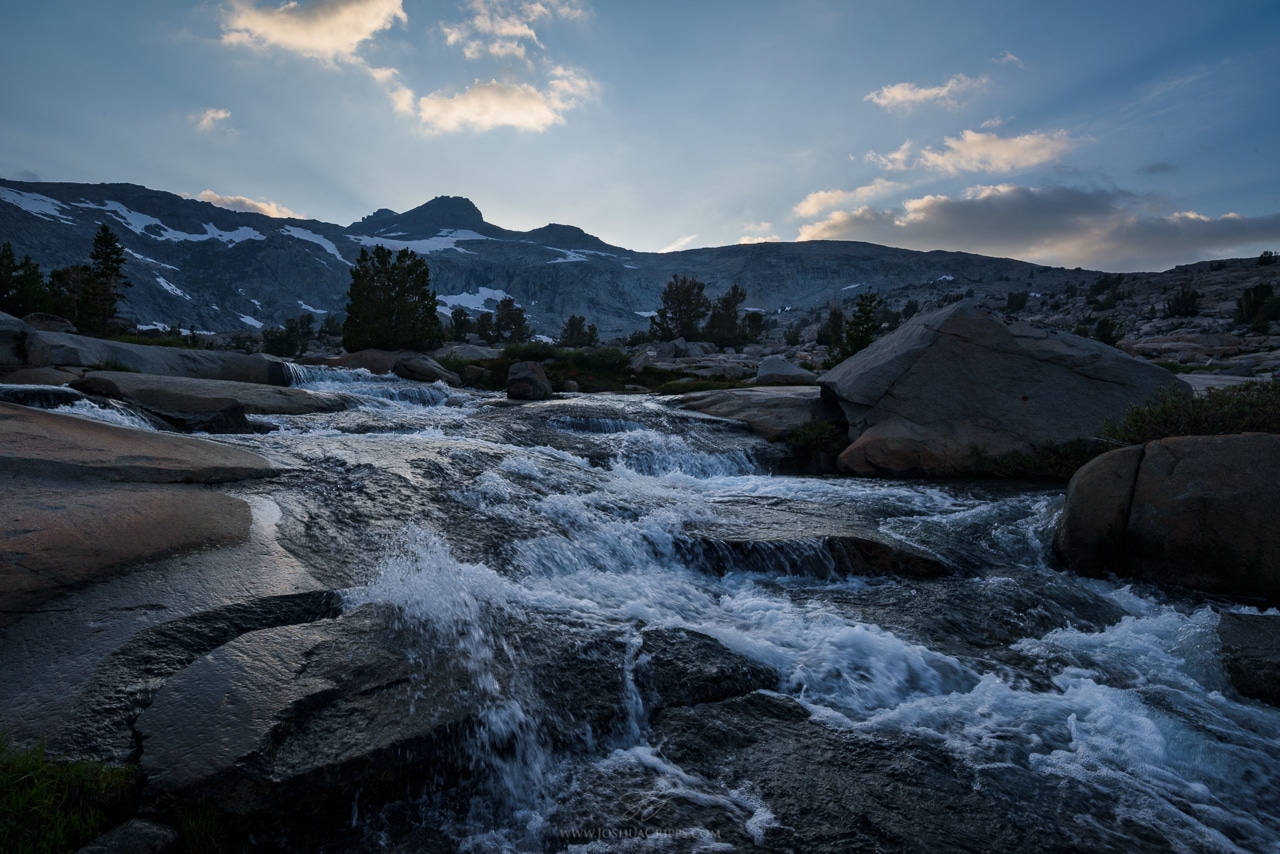 At this point it was only a few minutes before sunset so I shed my backpack, grabbed my camera and tripod, and practically ran down to the creek coursing through the center of the basin. The afternoon showers had broken and the sky was beginning to open up. As the settling sun streamed underneath the clouds they turned a lovely pink, and the mountains behind me lit up with a brilliant ruby color. I found a pretty cascade and snapped off a few shots. Then as quickly as it had come the color faded out and I retired back to the campsite to help prep dinner.