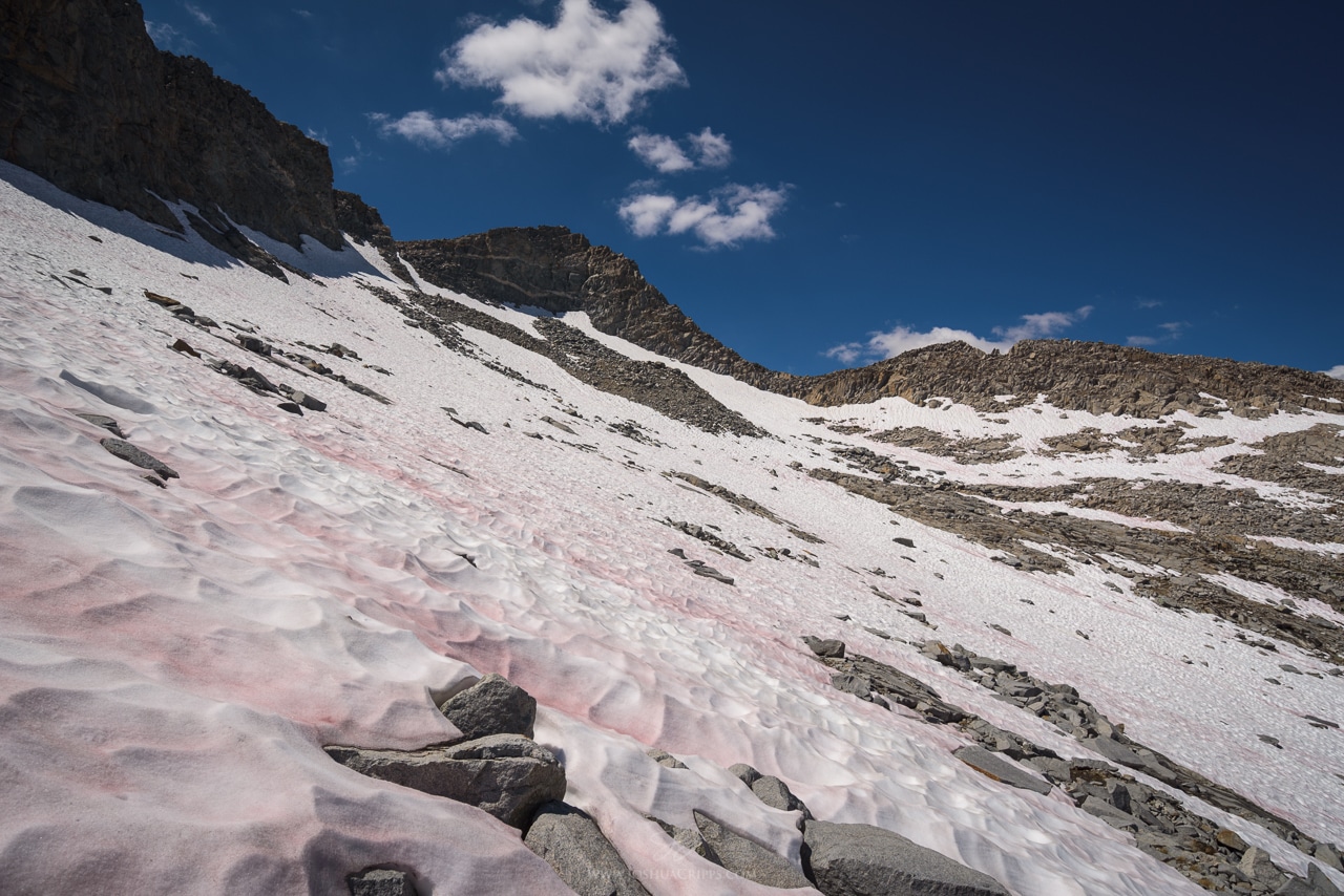 Instead we opted to head up and over a saddle to our southeast and find a cross-country route past the upper Marie Lakes and back down to camp. The saddle was completely snow-filled and we thought it would be quick and easy to follow it all the way up. But the steepness was deceiving from beneath and as we climbed it quickly increased from 25° through 35° and approached 45°-50° at the top. Along with the steepness the north-facing aspect made the snow much icier as we climbed and it was difficult to kick footholds in our hiking shoes. So we opted to jump off the snow onto the crumbly rock on the side of the gully. What followed was a heart-thumping 4th-class ascent through the shittiest, loosest, crappiest rock I’ve personally been on. I could see thousand pound boulders ready to break free from the wall and go tumbling down the hill. In fact, during our lunch break we saw one do exactly that, seemingly with no reason. And now here we were, yanking hard on the same decomposing crap. Needless to say we were both pretty pumped to finally ascend out of the choss and onto the saddle above.