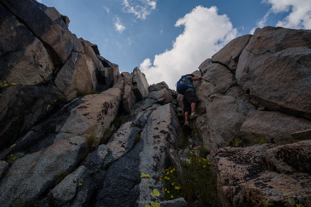 Now Joe is a fit guy but he lives at sea level, so the idea of scaling a 13,000-ft peak didn’t exactly have him doing cartwheels of joy. Nevertheless he was up for the challenge. So we packed some snacks and lunch, filled our water bottles from the insanely clear and delicious stream at our feet, and set off across the granite slopes.