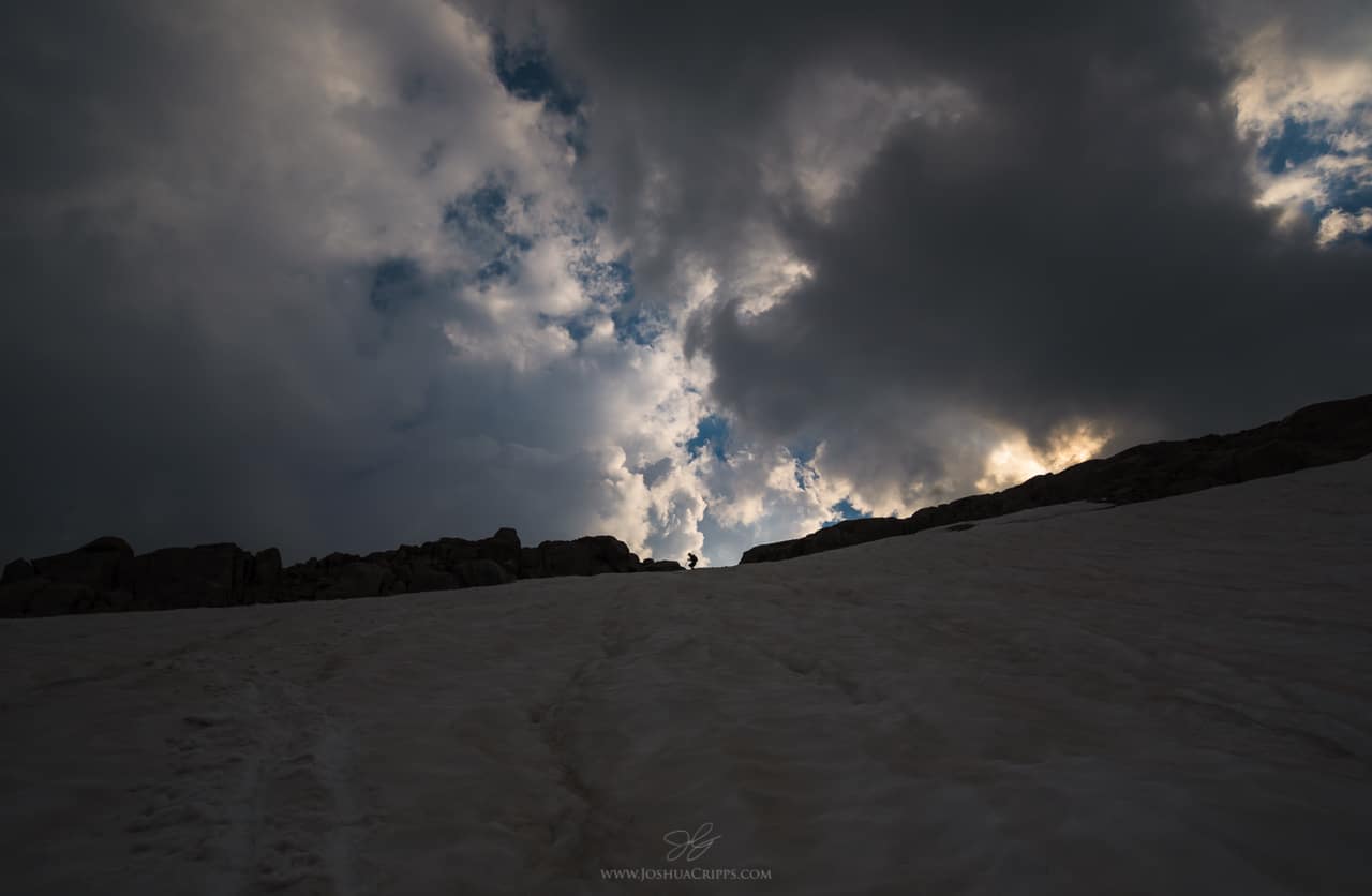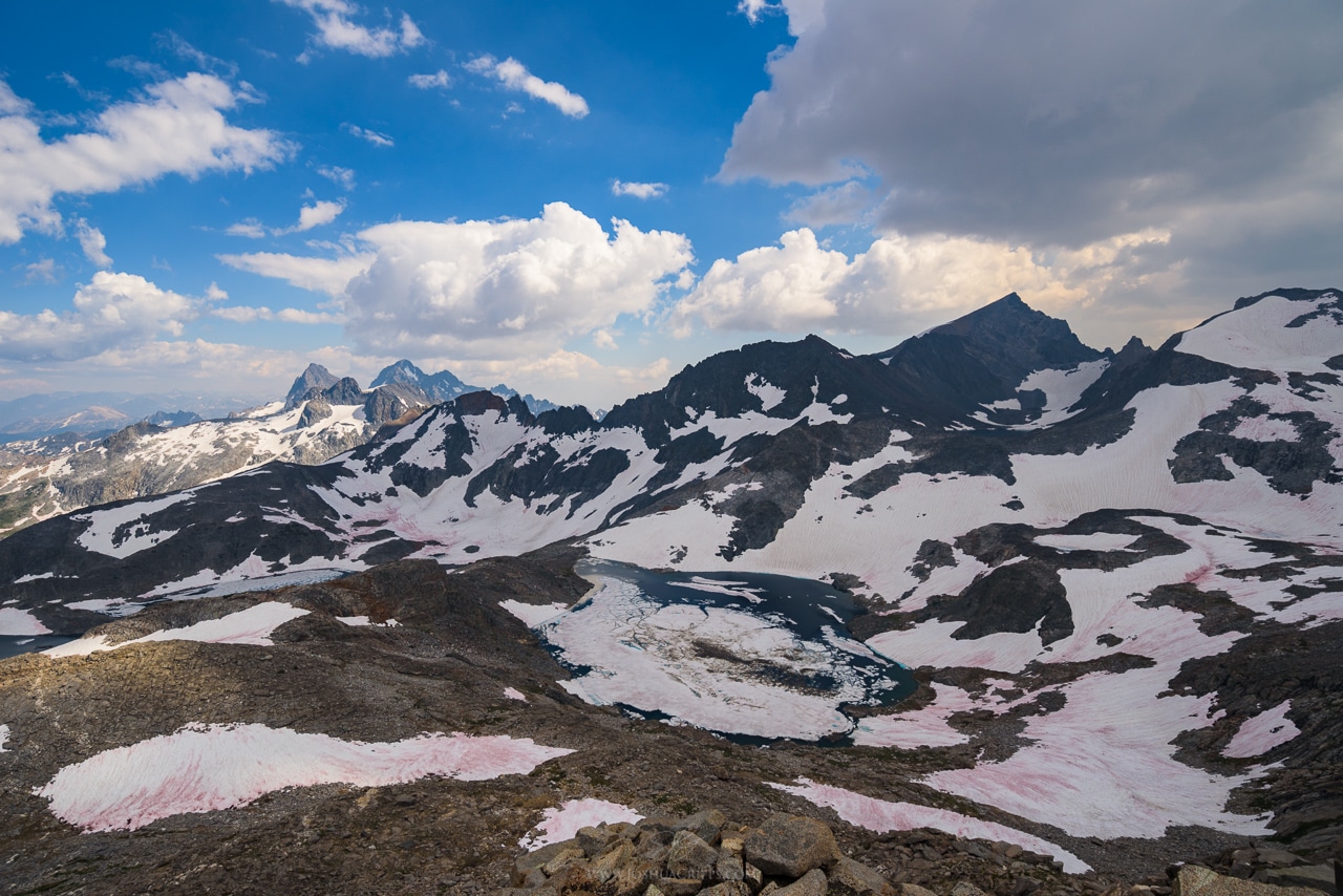 Reaching the saddle gave us an excellent idea of what the rest of the climb would entail: likely 3 more hours of snow travel to a distance ridge, where we’d have a class 3 climb to the summit. We’d been setting a relaxed pace for the day so far and we realized that 3-4 more hours of ascending would put us on the top in late afternoon. With thunderstorms beginning to brew and Joe feeling some effects from the altitude we decided this wouldn’t be a prudent course.