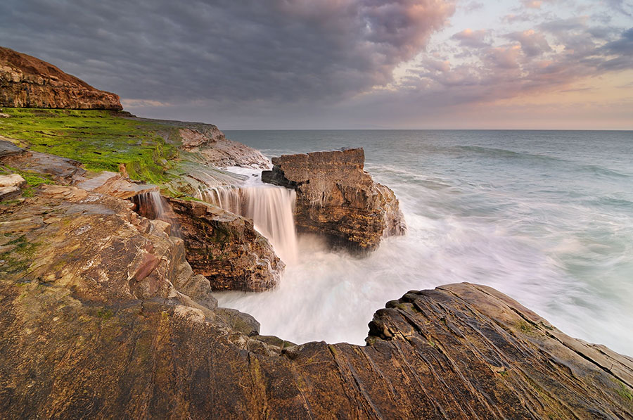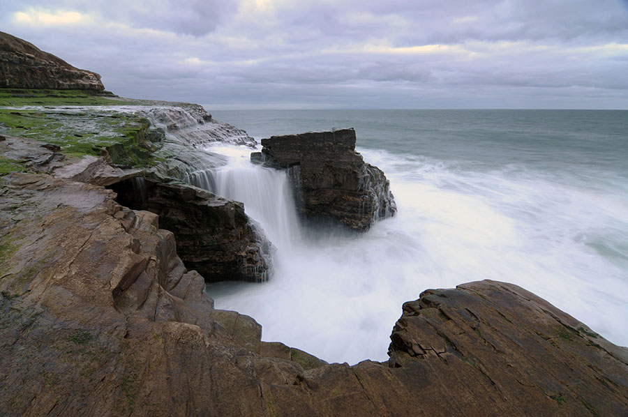 In early 2010 I was spending a lot of my afternoons scouting the Santa Cruz coast for new locations to shoot. On March 13th I came across a neat shelf which showcased cool features like a gaping sea cave, vivid green algae, and this rocky pinnacle. Even cooler, as the waves crashed against the shelf they would wrap around this pinnacle and form a 15-foot waterfall down the back side.