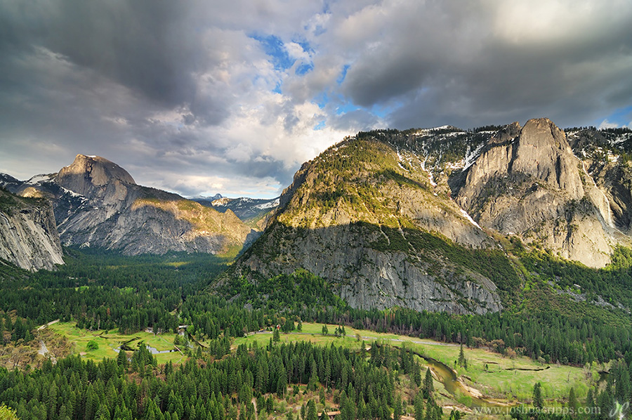 As I hiked up the endless, steep switchbacks along the Upper Yosemite Falls trail the storm clouds began to break up, and warm light was streaking through the Valley. By the time I got to Columbia Rock the texture and light saturating Yosemite were spectacular, and I was able to take a great photo of Columbia Rock.