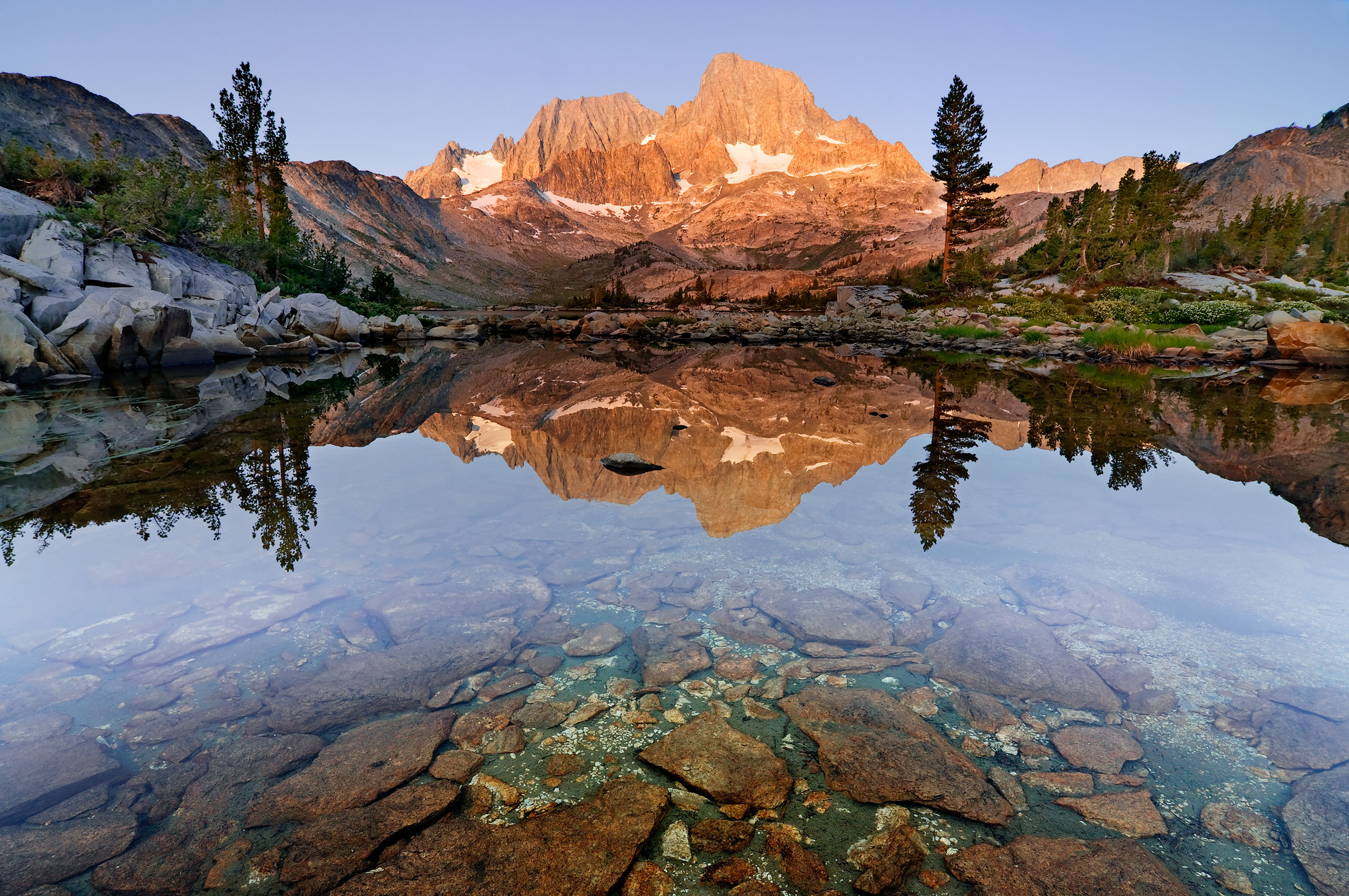 I took this photo early in my career, and it’s one of the first photos I was proud to have in my portfolio. During the summer of 2008, my friend Joe and I were on a backpacking trip through the gorgeous Ansel Adams Wilderness, which is sandwiched between Mammoth Lakes and Yosemite National Park. We gave ourselves four days to complete a 24-mile loop so that we’d have ample time to stop and enjoy every lake along the path. We camped at three incredible locations during the trip: Ediza Lake, Thousand Island Lake, and Garnet Lake, each offering their own stunning views of Mt. Ritter and Banner Peak. And while our days at Ediza and Thousand Island were wonderful, this morning at Garnet Lake offered perhaps my favorite moment of the whole trip. I awoke before sunrise and ventured down to the lakeshore. As I explored I came across this small inlet in the lake that offered a breathtaking perspective. The inlet was as still as water can be, creating a picture perfect reflection. Trees on the shoreline formed an elegant natural frame, highlighting the stunning mountains in the distance. As I prepped my camera equipment the sun rose, shining through some haze and casting a diffuse orange glow across the peaks. Looking at the beauty of the scene filled me with a profound sense of serenity, and the stillness of the morning was broken only by the sound of my camera’s shutter. I’ve never returned to this exact spot since that day in 2008. Although it is stunning, I am hesitant to go back for another look. The conditions I had on that one visit were so ideal it’s hard to imagine any other morning surpassing them.