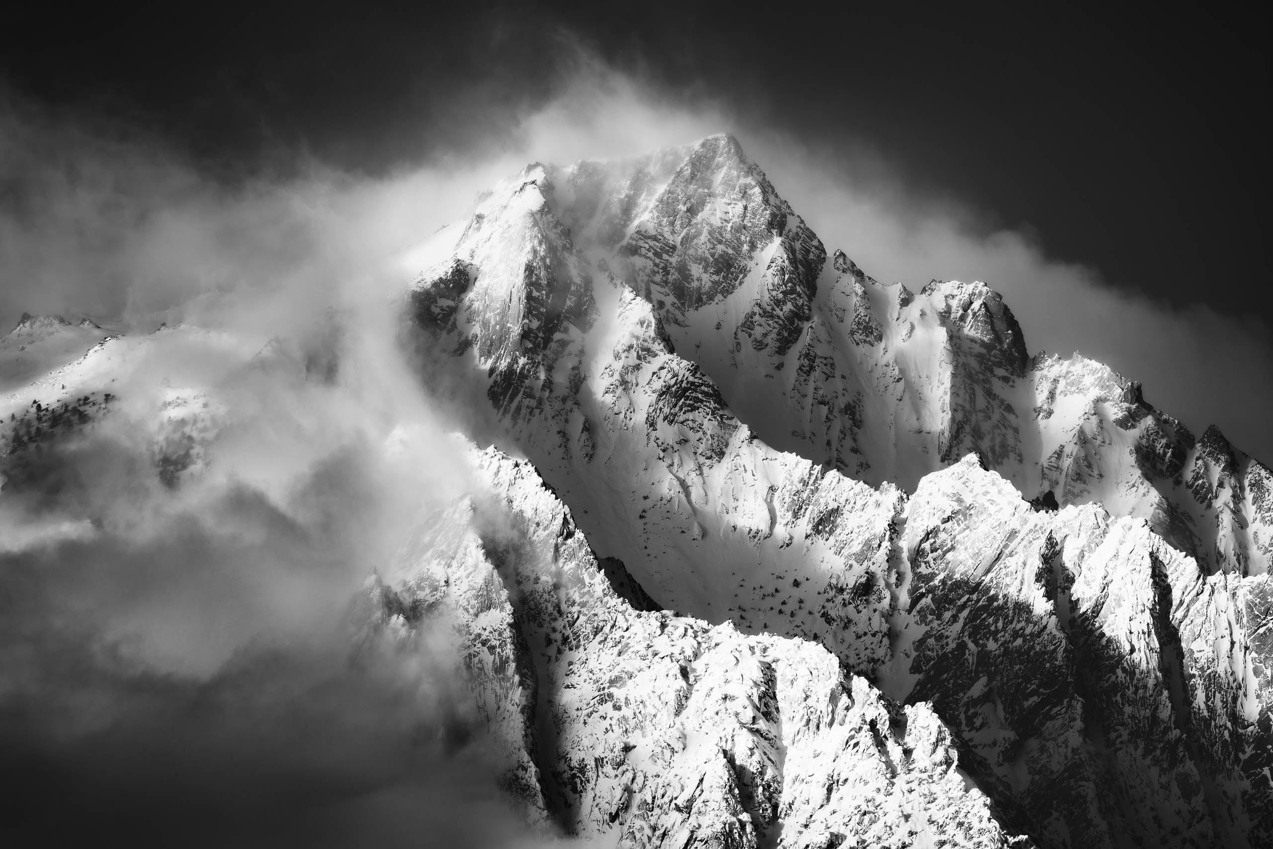 I couldn’t pull my attention away from this marvelous show, and I knew this could be an incredible focal point for a photograph. Ignoring the rest of the scene, I used my long lens to zoom into 400 mm, isolating the highest peaks and ridges of the mountain. As the atmosphere swirled, I waited for just the right moment. The clouds parted, sunlight streamed across the mountain, and the top of Lone Pine Peak emerged. I triggered my shutter and captured this image.