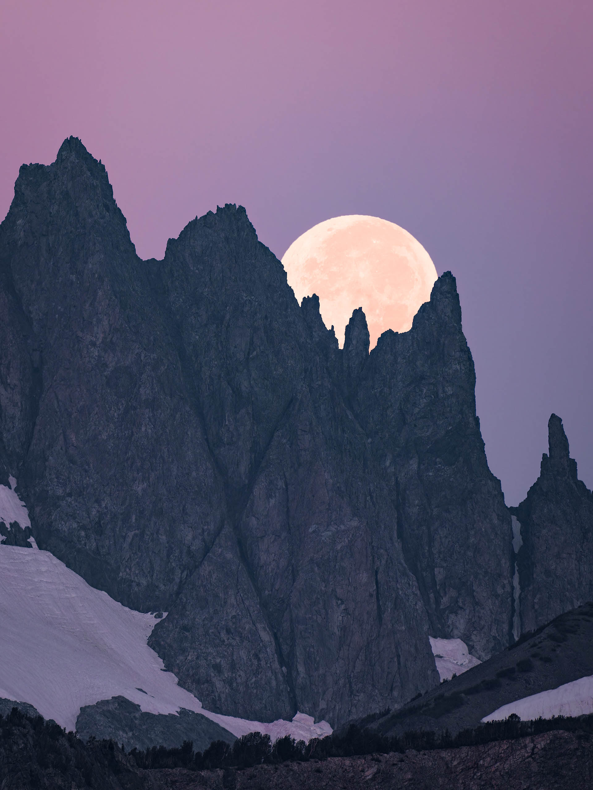 The Minarets are a stunning range of volcanic peaks just west of Mammoth Lakes. I knew that with their jagged skyline and sharp pinnacles they’d make a perfect natural frame for the setting full moon. After studying the angles and alignments for months, I determined that the September full moon would give me the best chance of creating the photograph I saw in my mind.