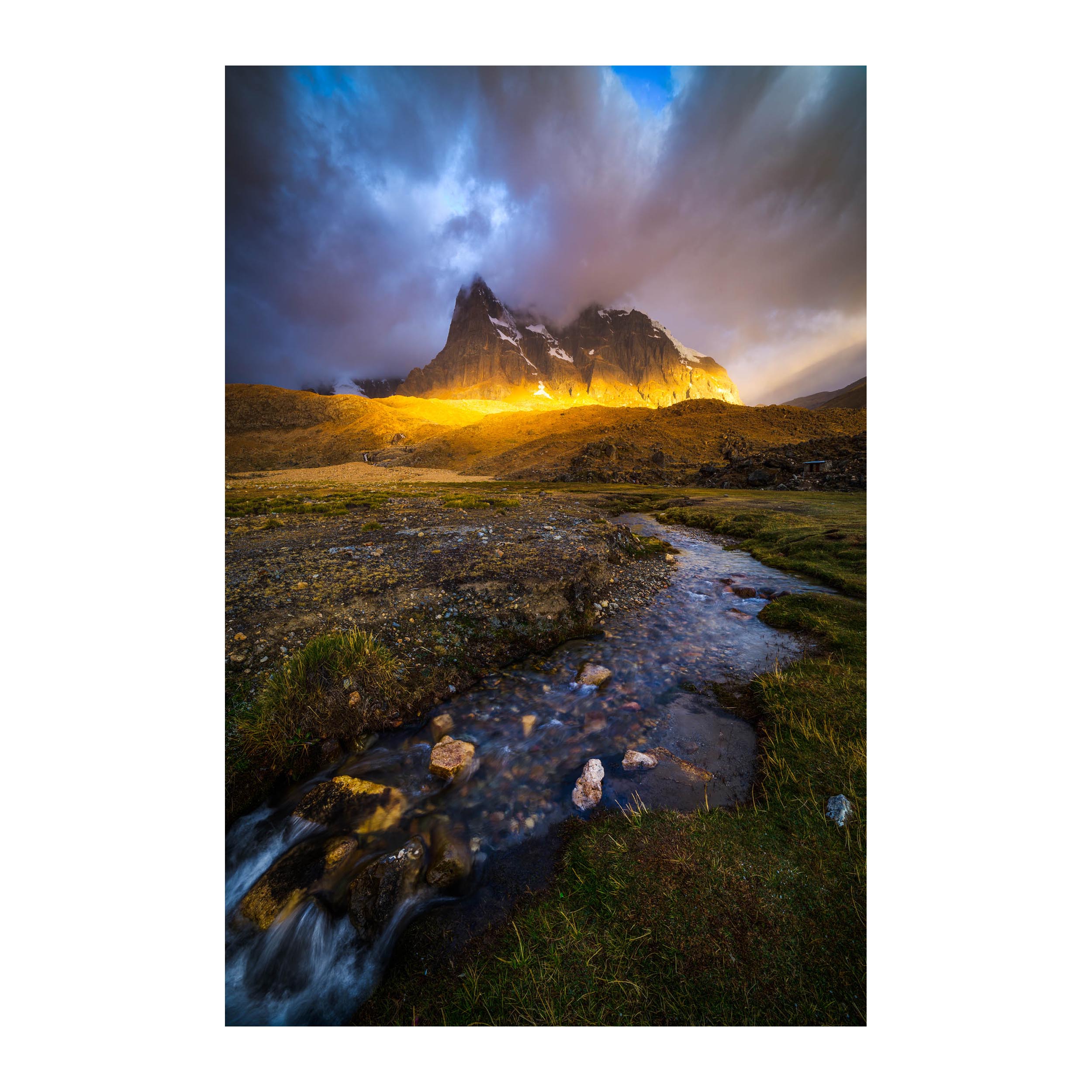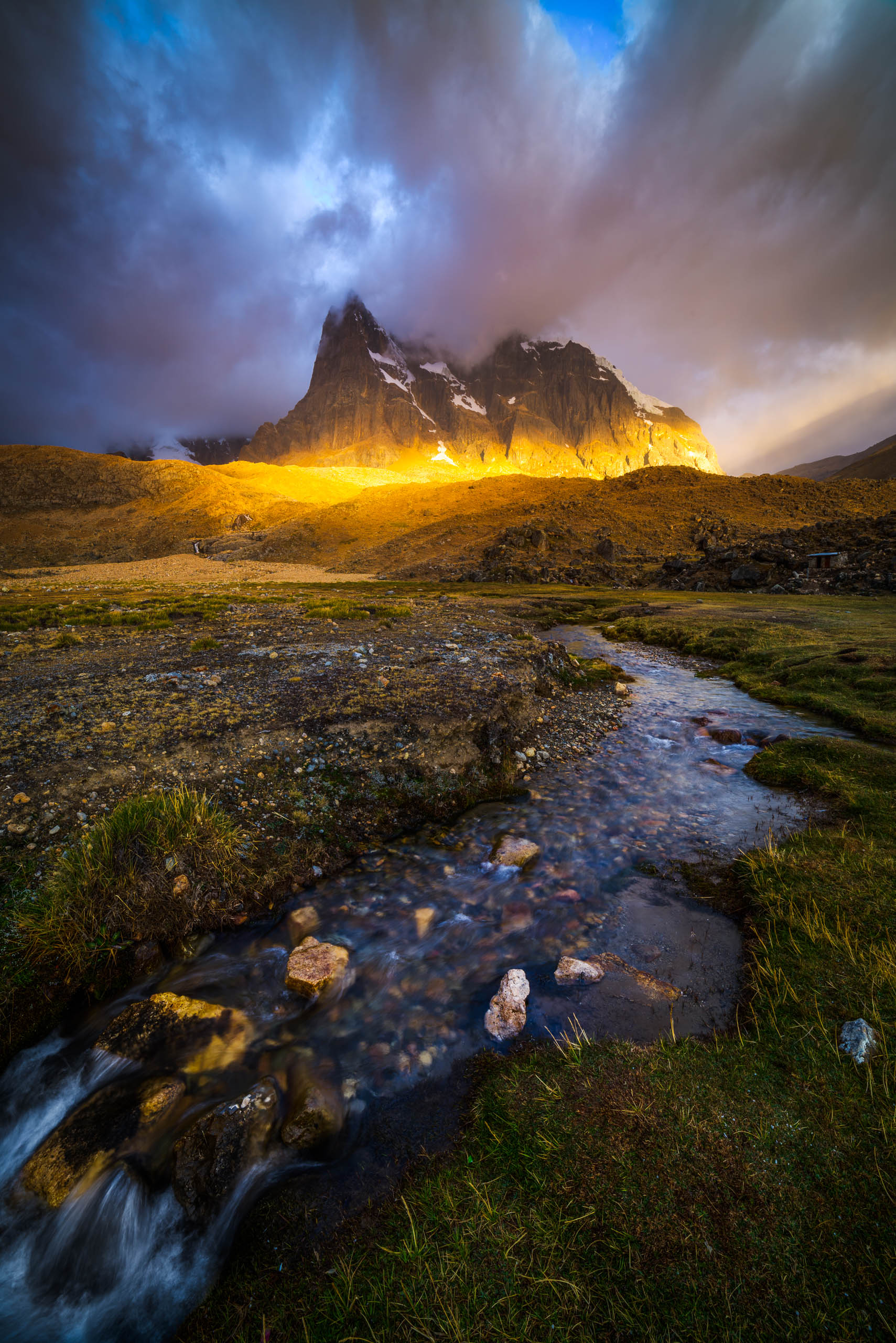 I didn’t want to take this picture. I really didn’t. I had caught a cold and that, combined with hiking 10 miles a day at 15,000 feet in the Peruvian Andes, was taking its toll on my system. As we rolled into our camp on day 6 of this 10 day trek all I could think about was how much I wanted a piping hot cup of tea and then to curl up and go to sleep. But halfway through the tea I peered out of my tent flap and saw a slit in the clouds letting some sun peek through. SUNUVA!!! Sleep or shoot, sleep or shoot? Thankfully the photographer in me was stronger than the sloth and I wearily managed to plop my camera down by this stream just as a laser of sunlight struck the base of Cuyoc, a 18,000-ft mountain in the Cordillera Huayhuash.