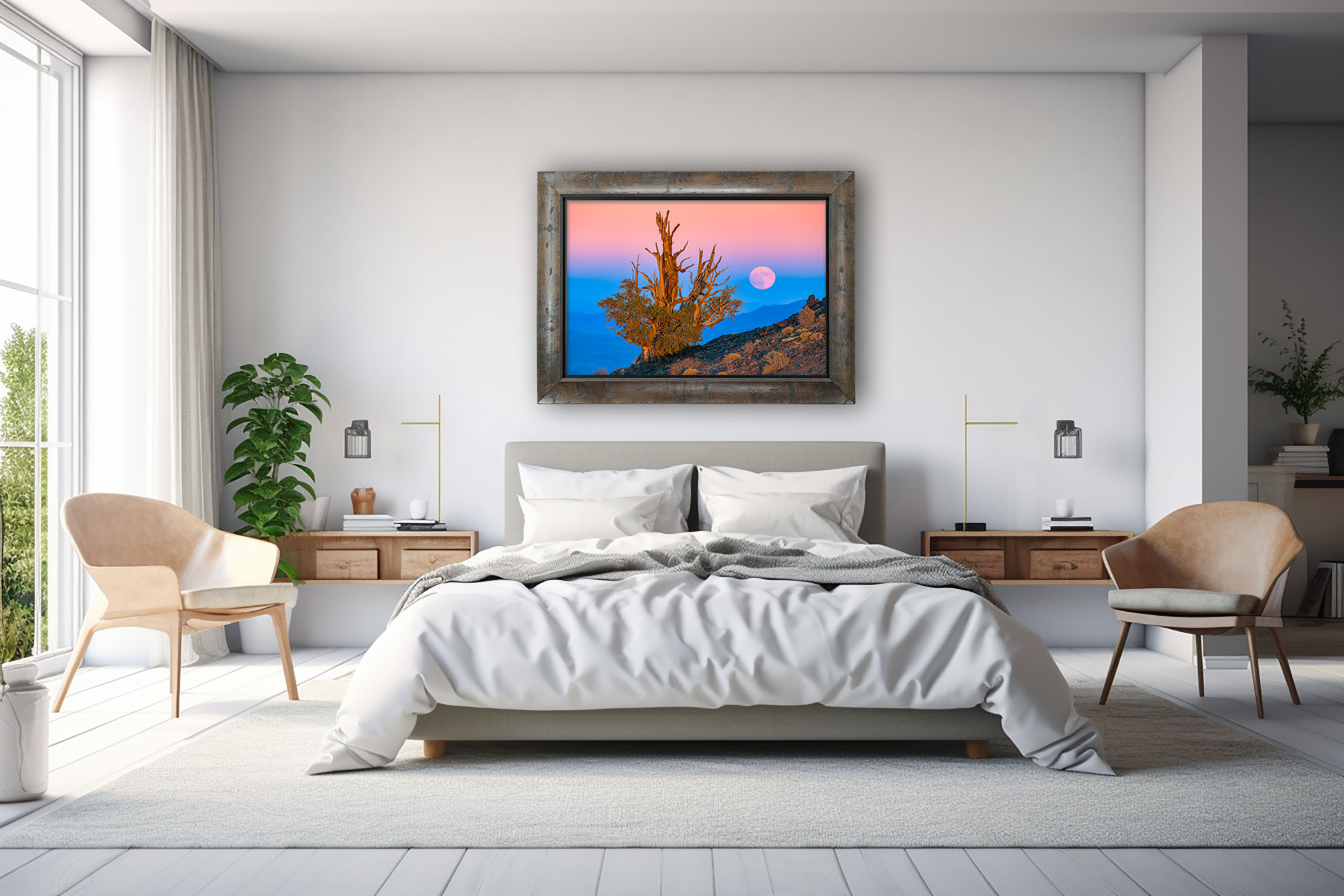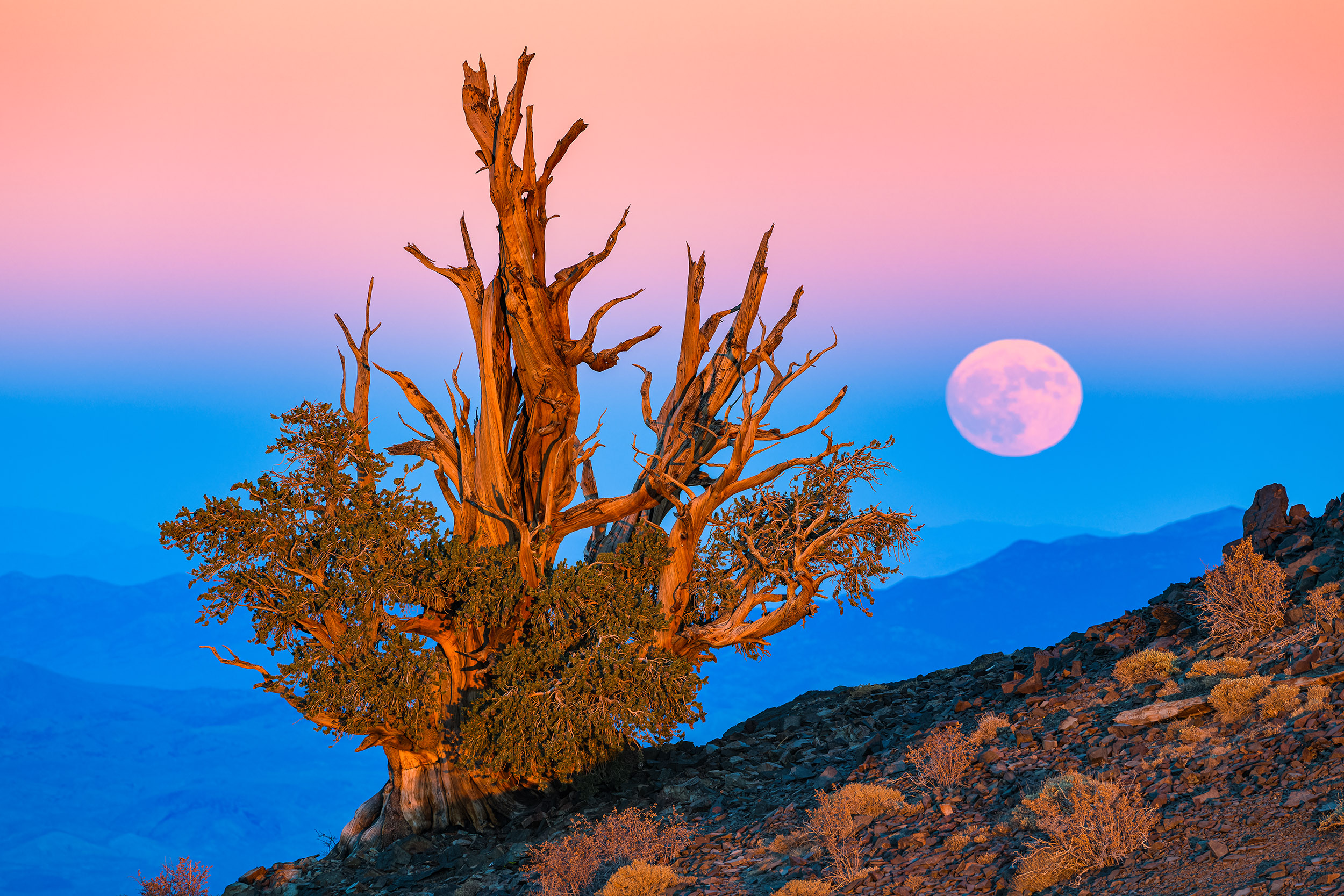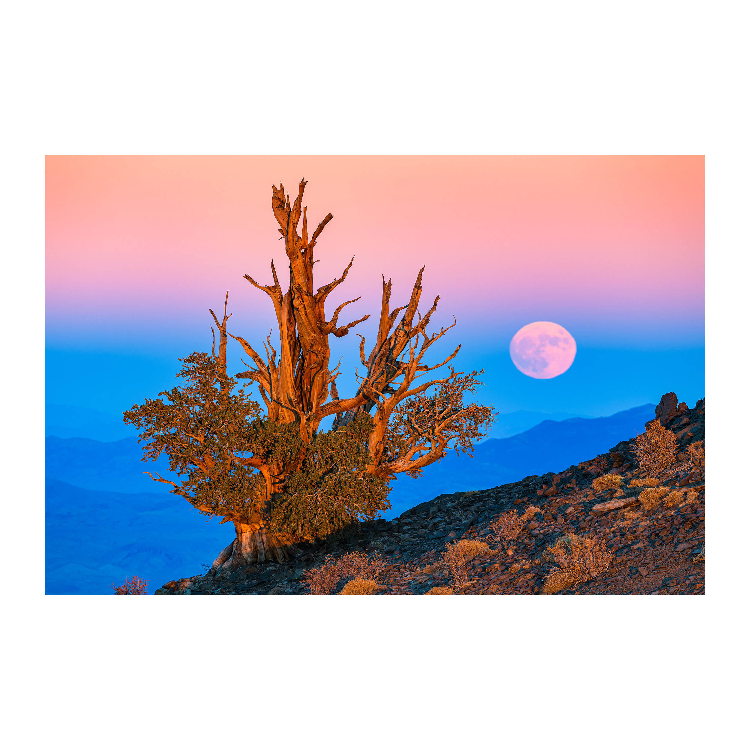 In late 2020, I began to seek out a photograph of the full moon rising at sunset next to a bristlecone pine, the longest-lived individual organism on the planet. Every time I stand among these stately trees I am awed and humbled by their resilience and 5,000 year life span. A mature bristlecone may have seen the full moon rise and set as many as 50,000 times, and I knew this endless dance between the moon and the trees would make a powerful subject for a photograph.