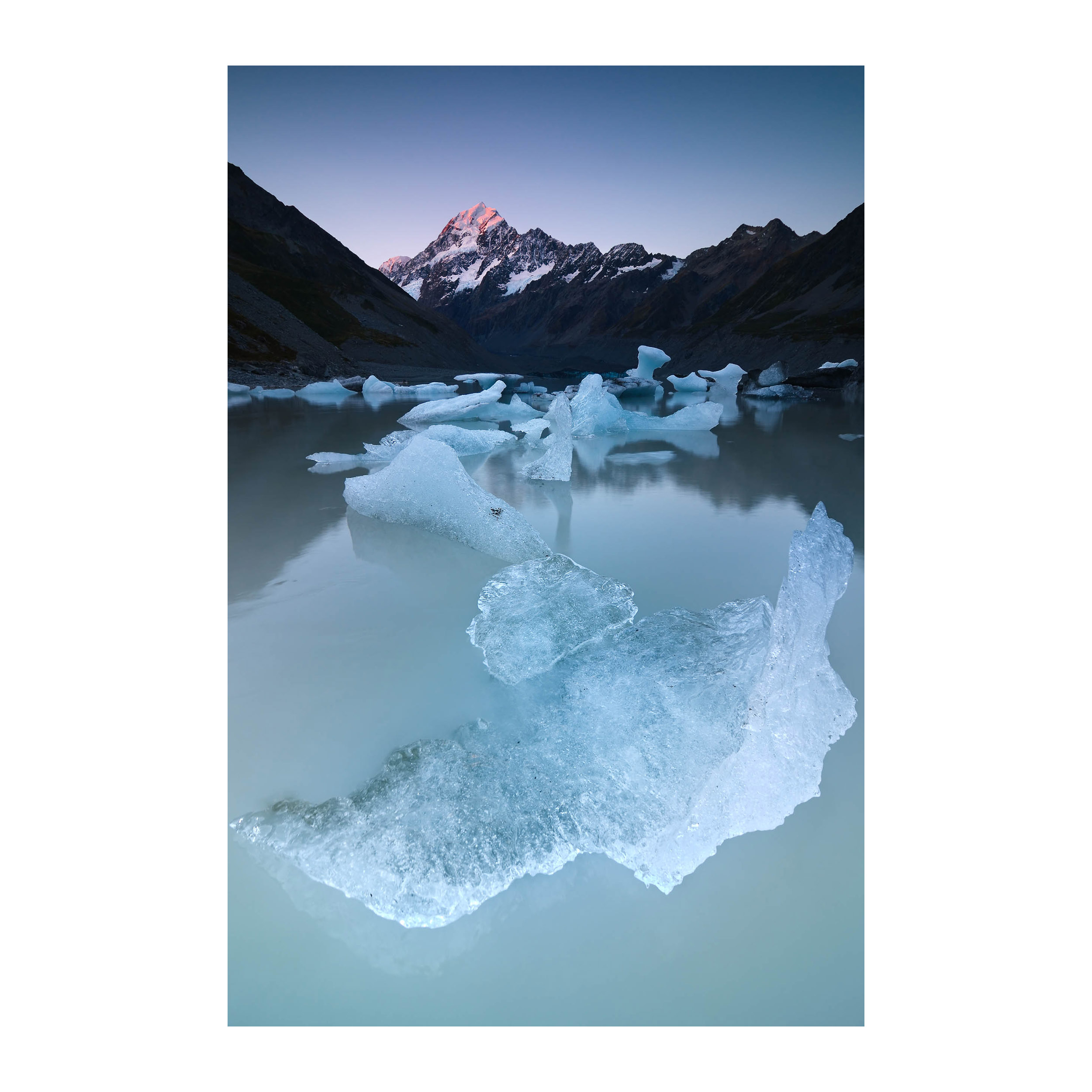 It turns out that glacial lakes are cold, really cold. Not that I noticed right away. I was wearing hip waders so I could stand thigh-deep in the just-above-freezing Hooker Lake while shooting icebergs and Mt. Cook at sunset. Because I wasn’t wet, I didn’t feel the cold right away. No, it was only after I’d been standing in the water for 40 minutes then tried to move that I felt it. My legs had turned to cold iron, and I could practically hear the creaks as I willed them to move back up to dry land. All in a day’s work, and well worth it for a sight like this one.