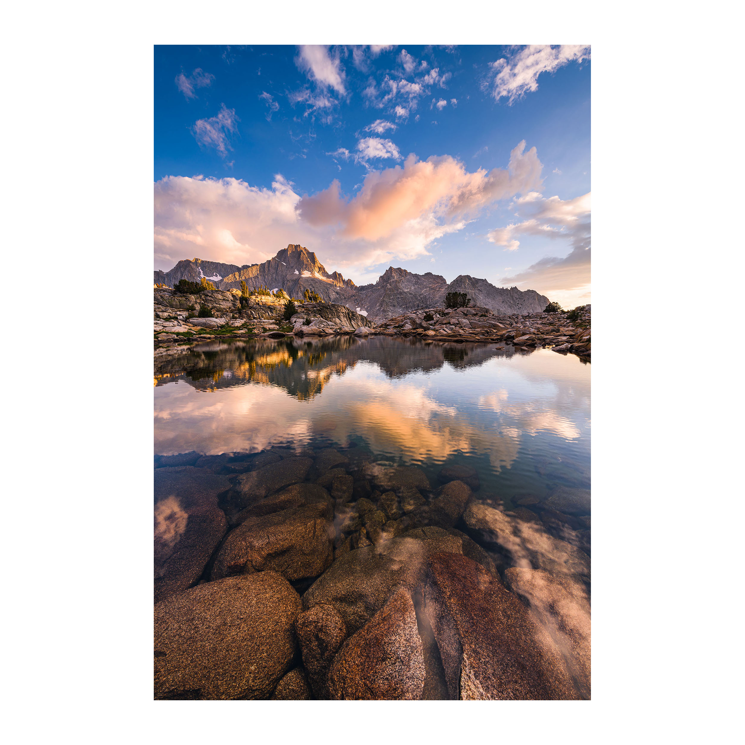 On the day I took this photograph I was at war with myself. I was standing on a rocky outcrop high in the Kings Canyon backcountry deciding which direction to hike. To my right was a welcoming valley full of idyllic meadows, gurgling streams, and bountiful sunlight. To my left was a menacing thunderstorm pounding an endless moonscape of Volkswagen-sized talus, without a single blade of grass to be seen.    These were my two options, and while at first glance the valley to right seemed like the obvious choice, I instead went left, battling into the thunderstorm and wrestling my way over the great blocks of granite in my path. As the rain spattered around me and lightning and thunder crashed over the outcrop where I had just been standing, I was having second thoughts about my choice. But I continued nevertheless, because I had made a promise to myself that I wasn’t going to break.   I had heard of the legendary beauty of the Gardiner Basin, but on this trip I was finally going to see it for myself. Moreover, I wanted to photograph it during the final moments of a monsoon thunderstorm. This goal was why I decided to press on into the storm, rather than retreat to a valley full of sunshine. In the world of landscape photography, conditions are never guaranteed. And if I wanted to see the Gardiner Basin at the tail end of a thunderstorm, well then I had to hike to the basin during a thunderstorm.   But I have experienced many dozen, if not hundreds, of Sierra thunderstorms, and I know that they have a tendency to dry out after a few hours of ferocious rain. Sure enough, as I approached the lip of the talus field, the storm began to break, exposing the entirety of the basin to view. Within minutes, a brilliant, supernumerary rainbow appeared behind me, arcing over the mountains to the east. To date this abrupt change from ominous storm to intense beacon of light is one of the most profound moments I’ve experienced in the backcountry.    After photographing the rainbow for nearly an hour (!), I set off to explore the basin in more depth. I quickly came to a series of tarns set high on a granite bench. Due to their position overlooking the basin, these tarns seemed to be the world’s most incredible infinity pools. They reflected everything in sight, from the shining face of Mount Gardiner to the lingering remnants of the thunderstorm. I felt a deep peace wash over me and had to put the camera down just so I could exist within the landscape for a few moments. My heart was soon overflowing and I knew I couldn’t hold back any longer.    I grabbed my wide angle lens and composed a vertical image to show the boulders beneath the tarn’s surface in addition to the expansiveness of the sky. The sun slipped closer to the horizon and cast a cozy blanket of warm light across the scene. I knew a special moment was at hand, and I pressed the shutter button, capturing this photograph.