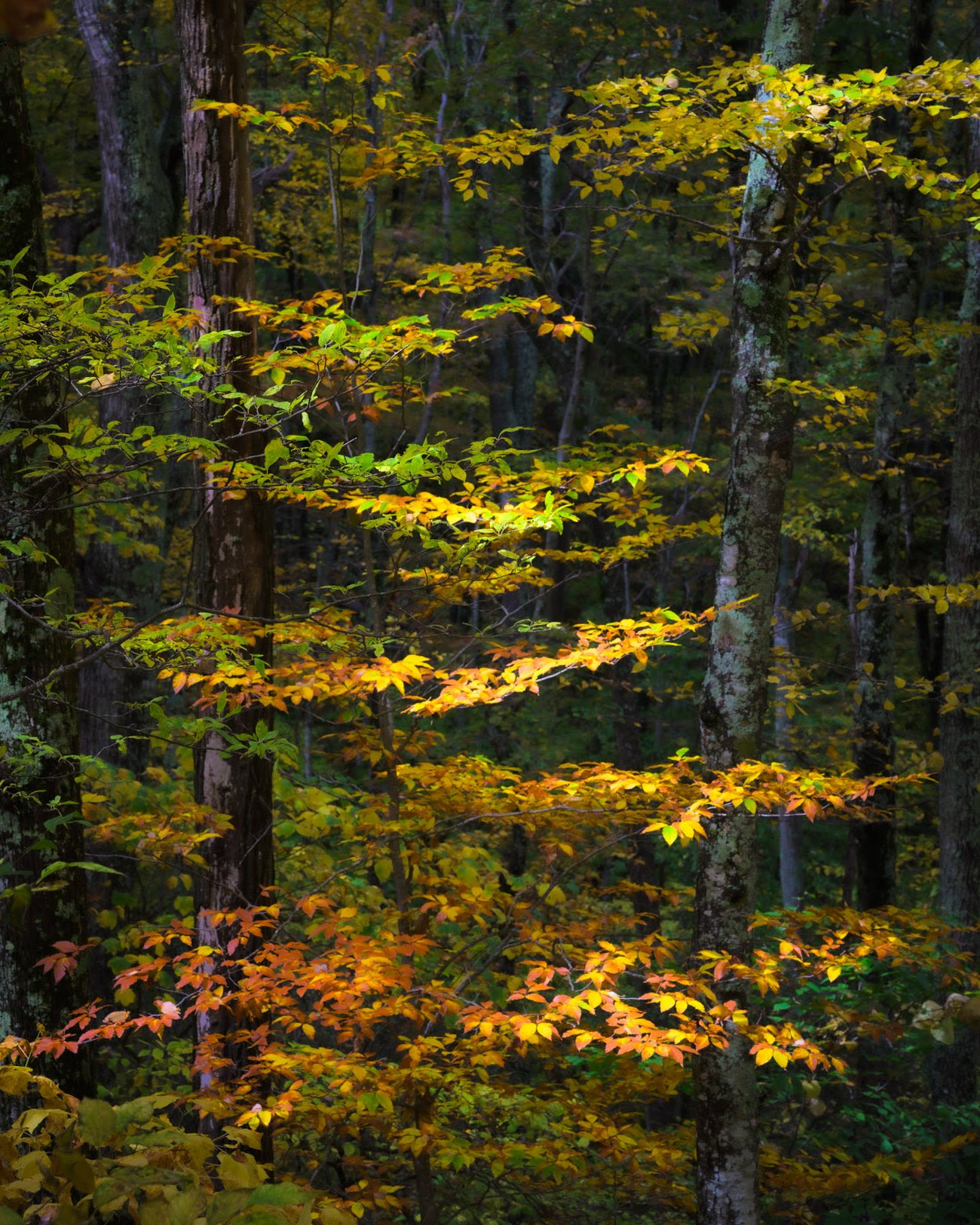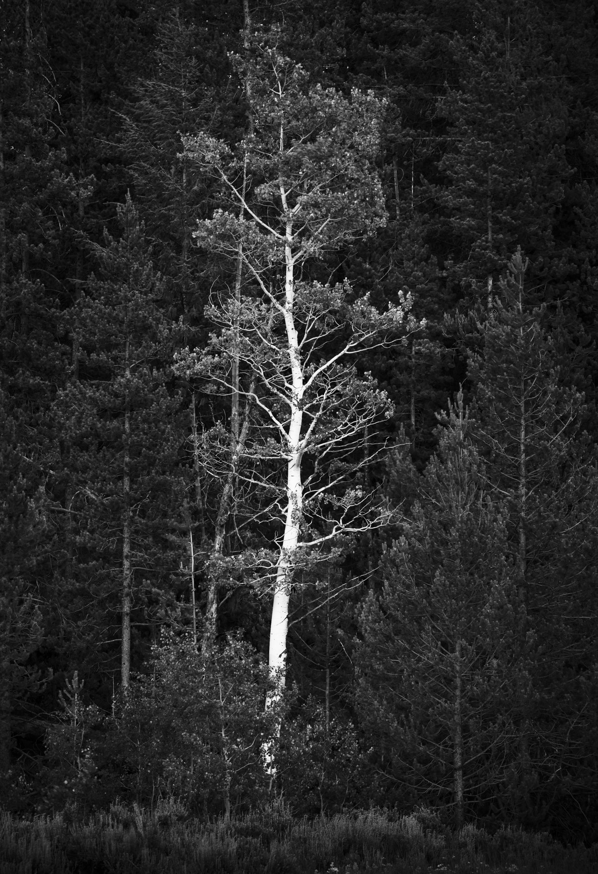So, I knew that to make the tree stand out and really highlight the concepts in my mind, I could emphasize the tonal contrast. I framed the shot to include the aspen tree and its surrounding crowd of pines. Then after taking the photo, I brought the raw file into Lightroom, converted it to black and white, and did some fine-tuned dodging and burning to help separate the aspen tree from the rest of the pines, creating a final image evocative of the ideas I had when viewing the scene.