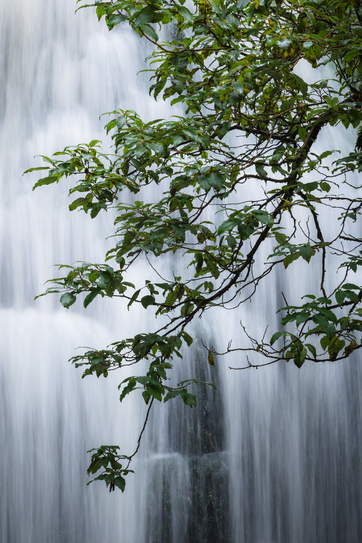 In this scene, I was photographing a waterfall in New Zealand. I loved how the rushing water of the cascade contrasted with the stillness of the branches. That was the main idea of the photo. So I started thinking about how those two subjects contrasted visually with each other and noticed strong textural and tonal contrasts. But in my wider frame (left photo), the texture and tone of the branches blended in too much with the other foliage in the scene. I put on a long lens so that I could isolate just the part of the cascade that best showed the texture and tone contrasts between the water and branches (right photo). As a consequence, the idea of the scene is represented clearly.